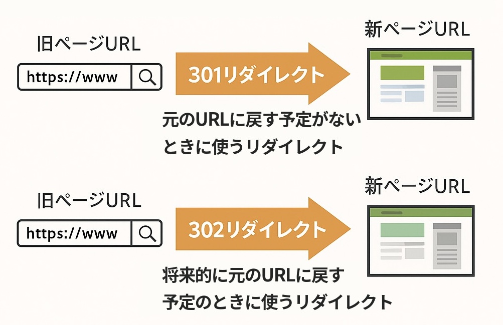 - ただし、リンク評価自体は302でも新URLに伝達されるため、「評価が消える」のではなく「旧URLに保持され続ける」イメージになる