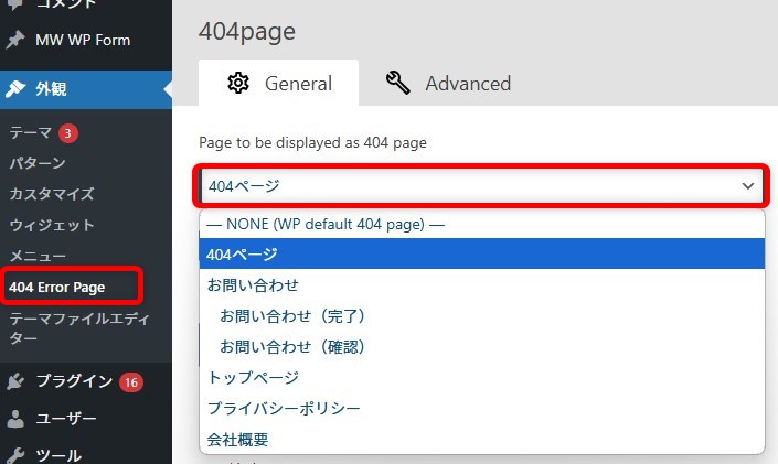 プルダウンメニューから作成した404ページを選択し、変更を保存。
