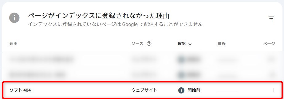 • 「ページがインデックスに登録されなかった理由」の一覧から「ソフト404」を選択