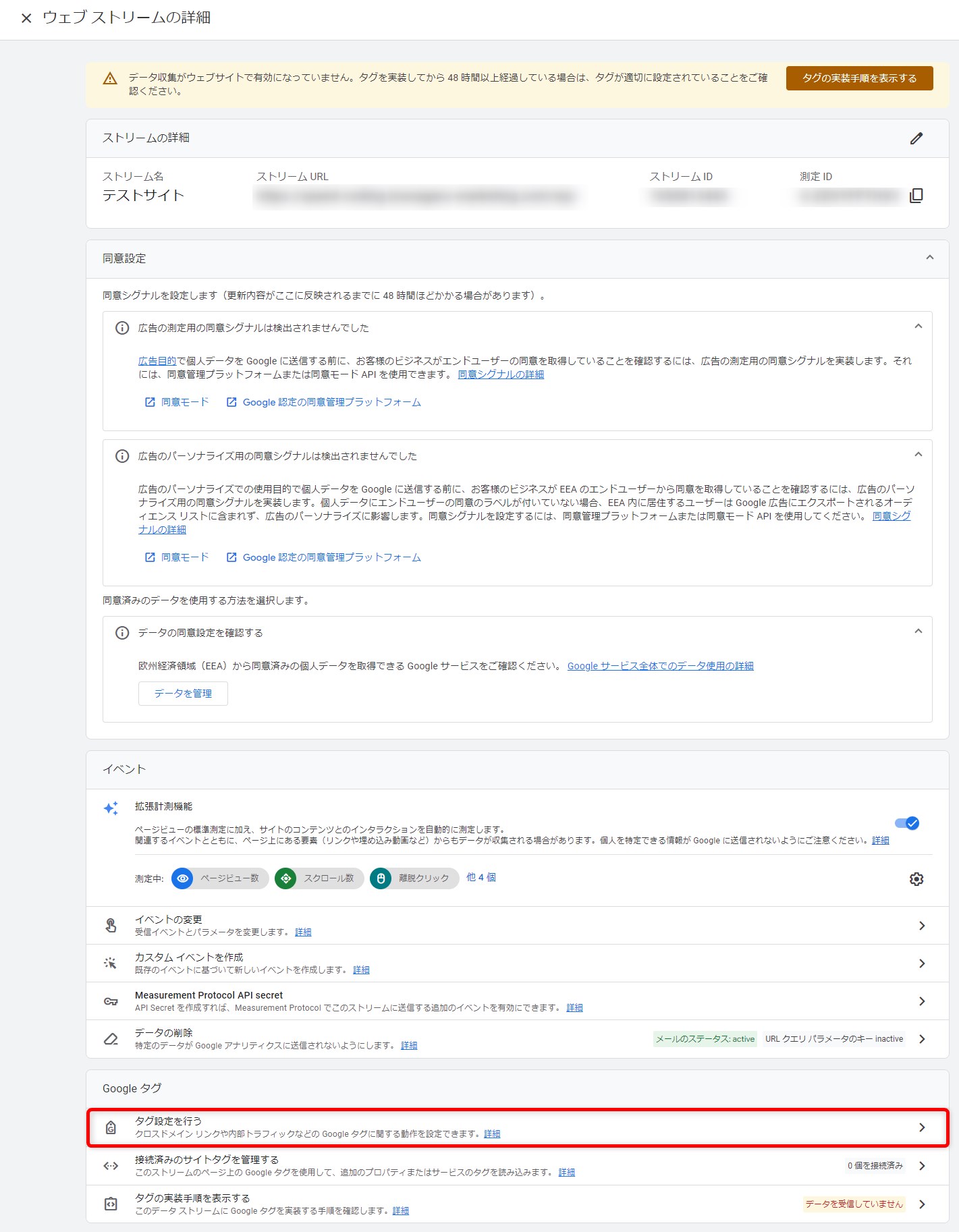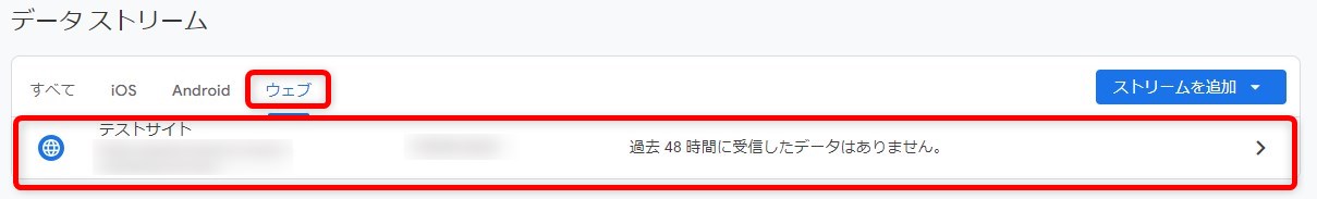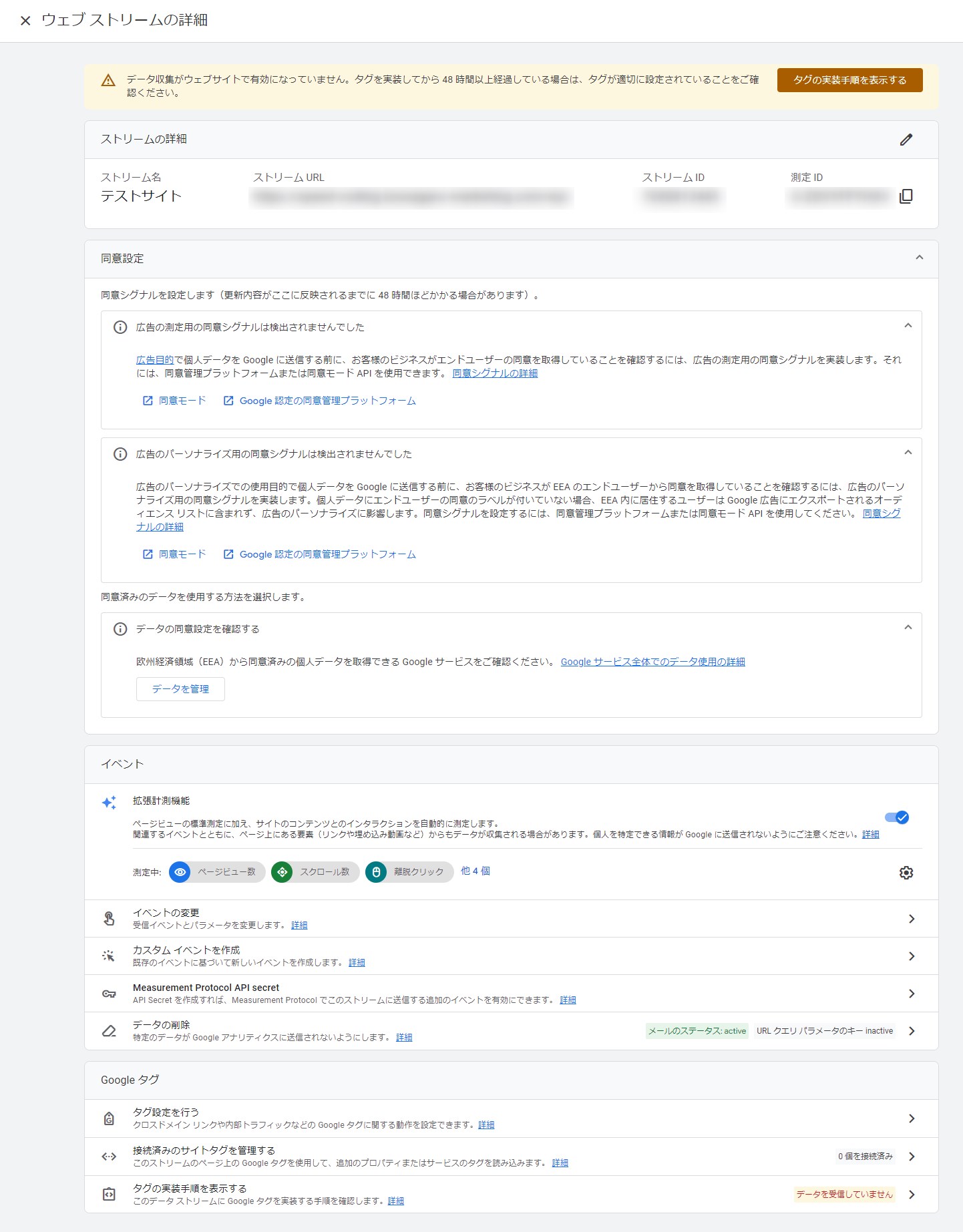 以下のようなウェブストリームの詳細画面になれば、Googleアナリティクスアカウントの開設手順は完了です。
