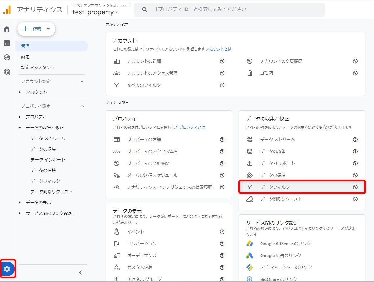 「管理」→「データの収集と修正」より「データフィルタ」をクリックします。