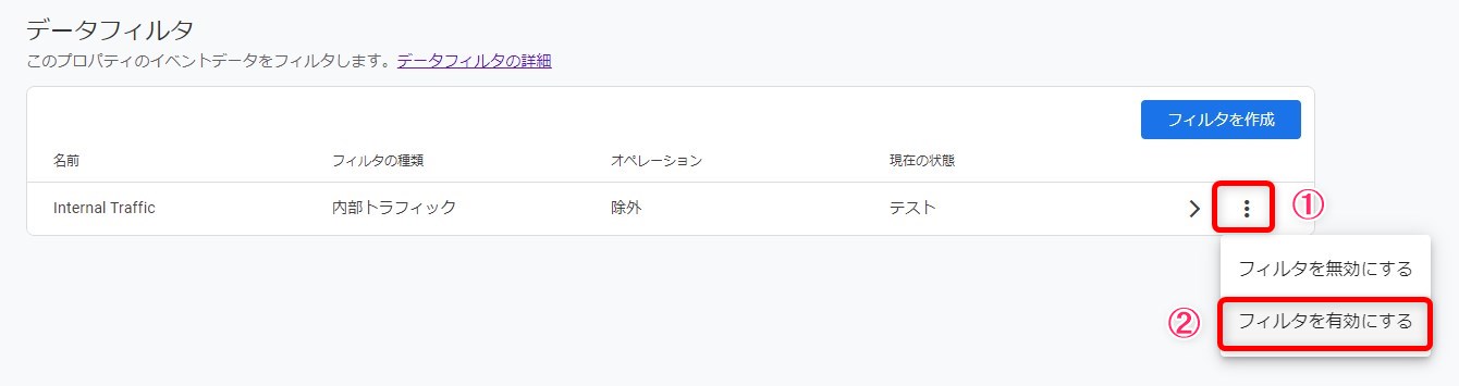 設定したフィルタの「︙」をクリックし、「フィルタを有効にする」を選択します。