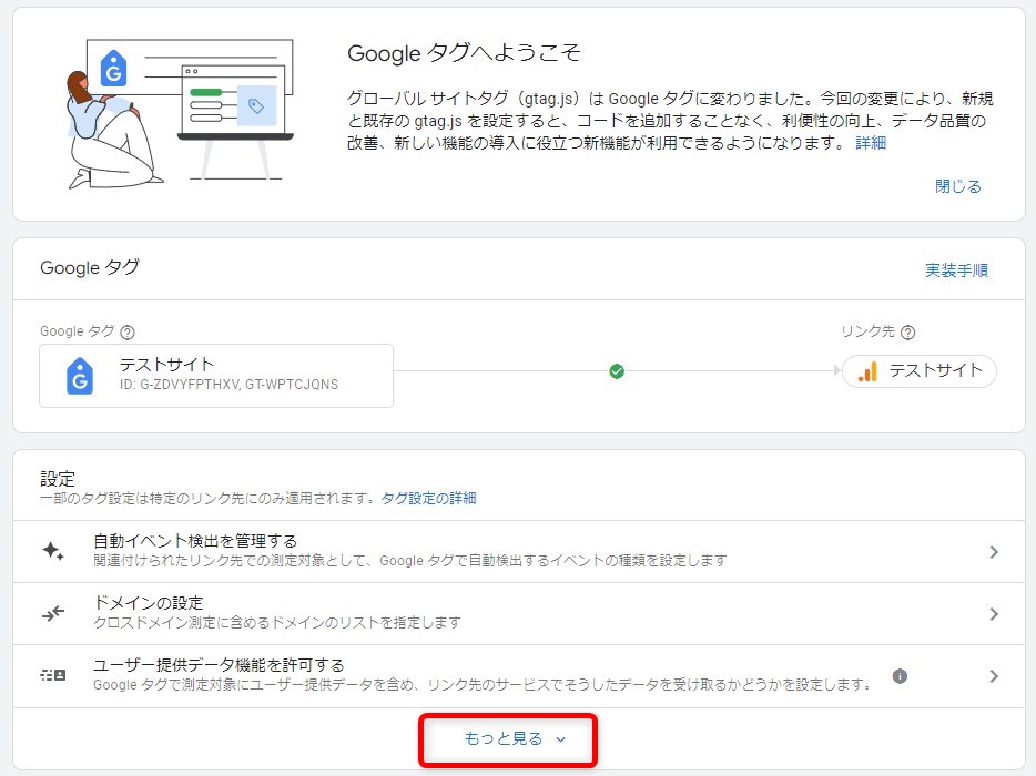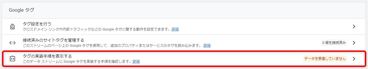 Googleタグの「タグの実装手順を表示する」をクリックします。