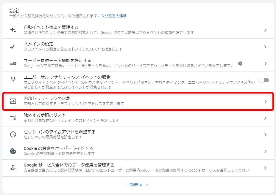 設定の「もっと見る」をクリックし、「内部トラフィックの定義」を選択します。