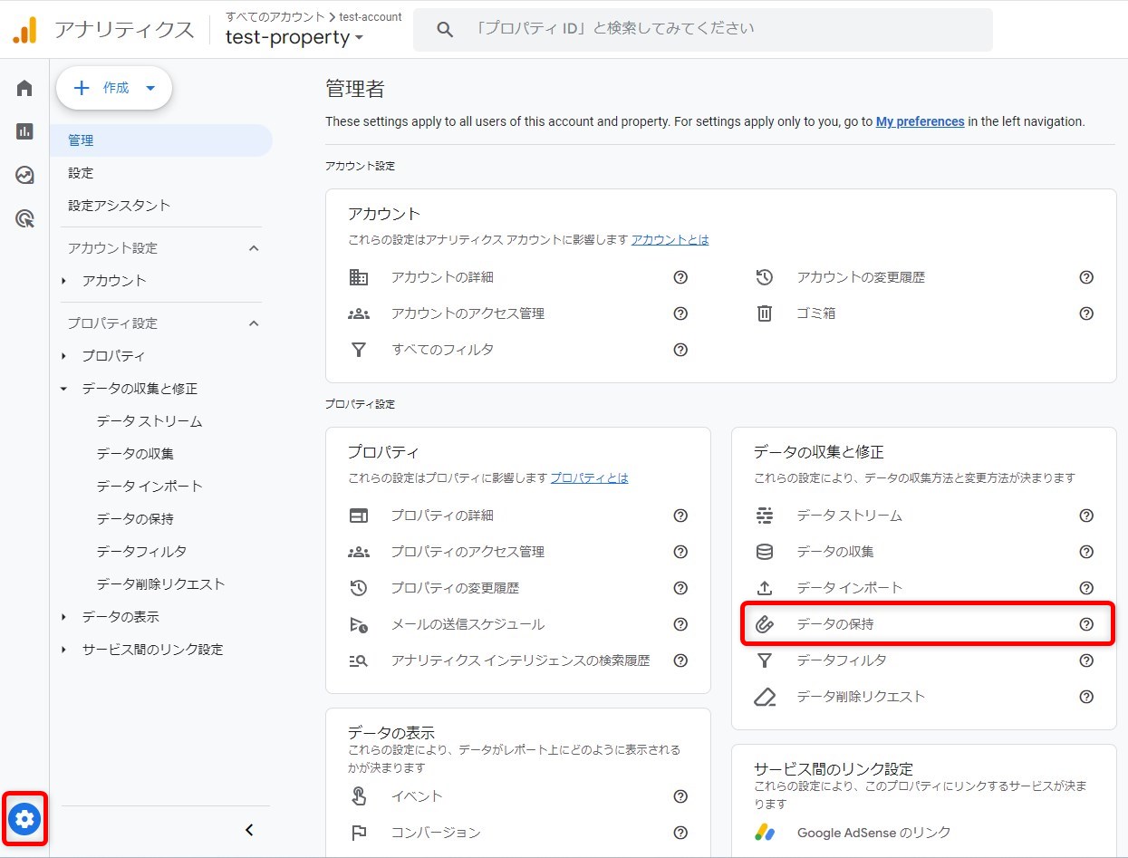 「管理」→「データの収集と修正」より「データの保持」をクリックします。