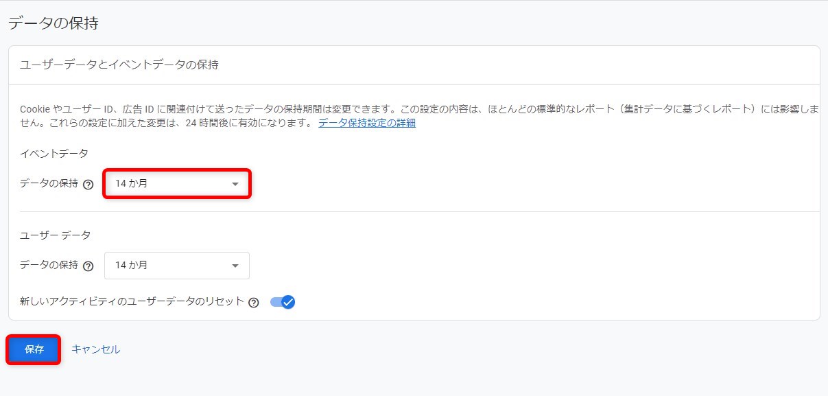 次に、イベントデータの「データ保持」を「14か月」に変更し、「保存」をクリックします。