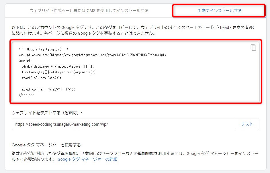 「手動でインストールする」を選択し、Googleタグをコピーします。