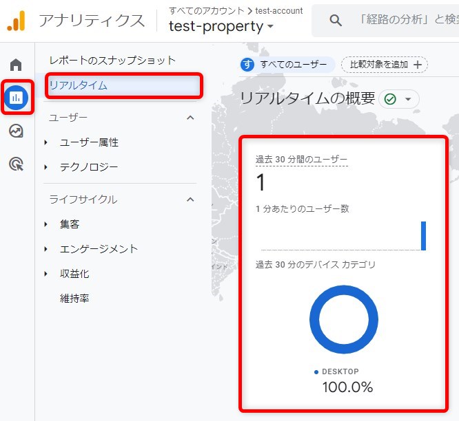 「過去30分間のユーザー」に数値が反映されていれば、正常に動作しています。