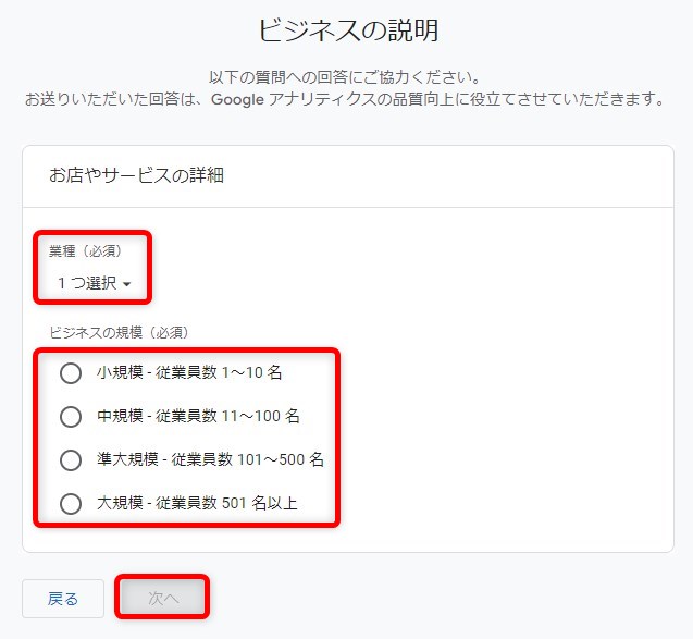 「業種」「ビジネスの規模」を選択し、「次へ」をクリックします。