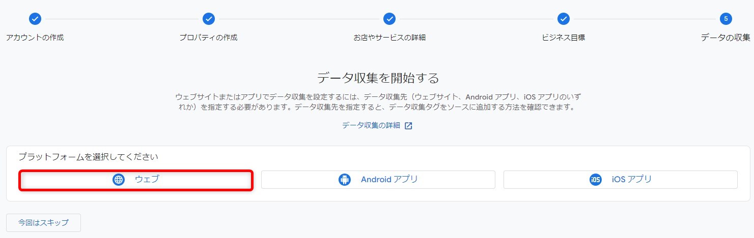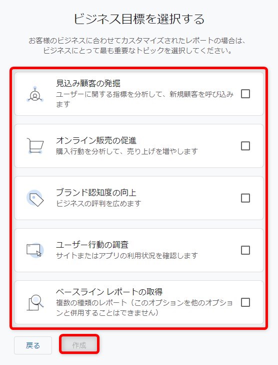 アナリティクスを使う上での目標を選択し、「作成」をクリック。