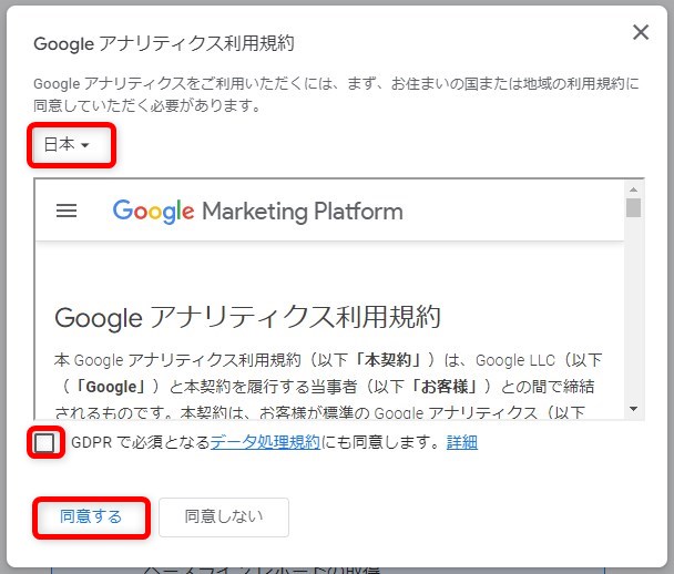 アナリティクス利用規約を「日本」に変更し、内容に問題がなければ「同意する」をクリックします。
