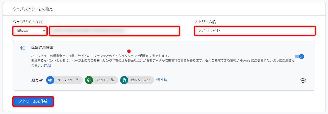 ウェブサイトのURL、任意のストリーム名を入力し、「ストリームを作成」クリックします。