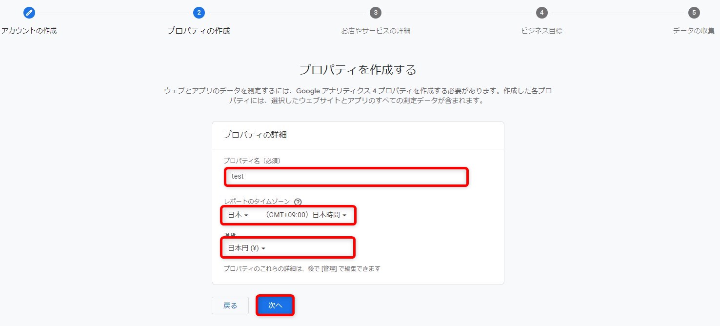任意のプロパティ名を入力し、「レポートのタイムゾーン」を「日本」、「通貨」を「日本円(¥)」に設定し、「次へ」をクリックします。