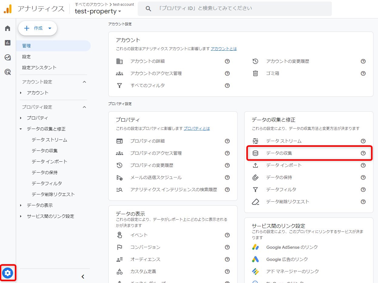 「管理」→「データの収集と修正」の「データ収集」をクリックします。
