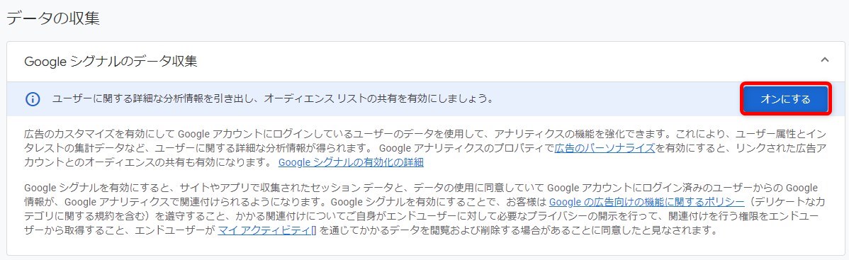 Googleシグナルのデータ収集を「オンにする」をクリックします。