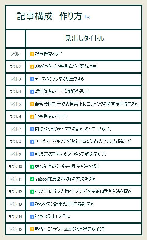 そうだね。実際にこの記事も、[記事構成 作り方]というテーマで、記事構成を作成しているんだ。