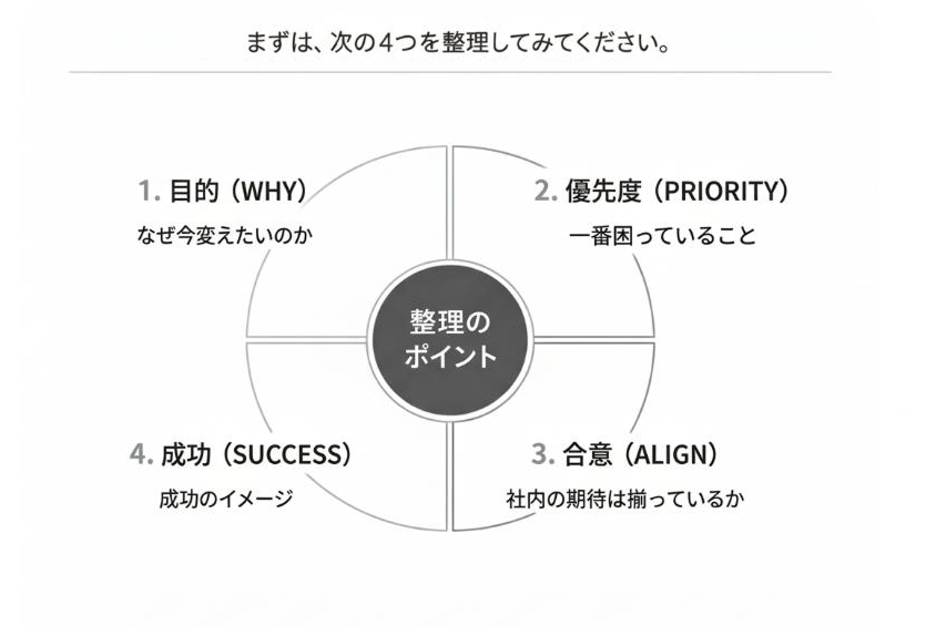 ①なぜ今なのか ②何を優先するのか ③社内の認識は揃っているか ④成功の形をイメージできているか