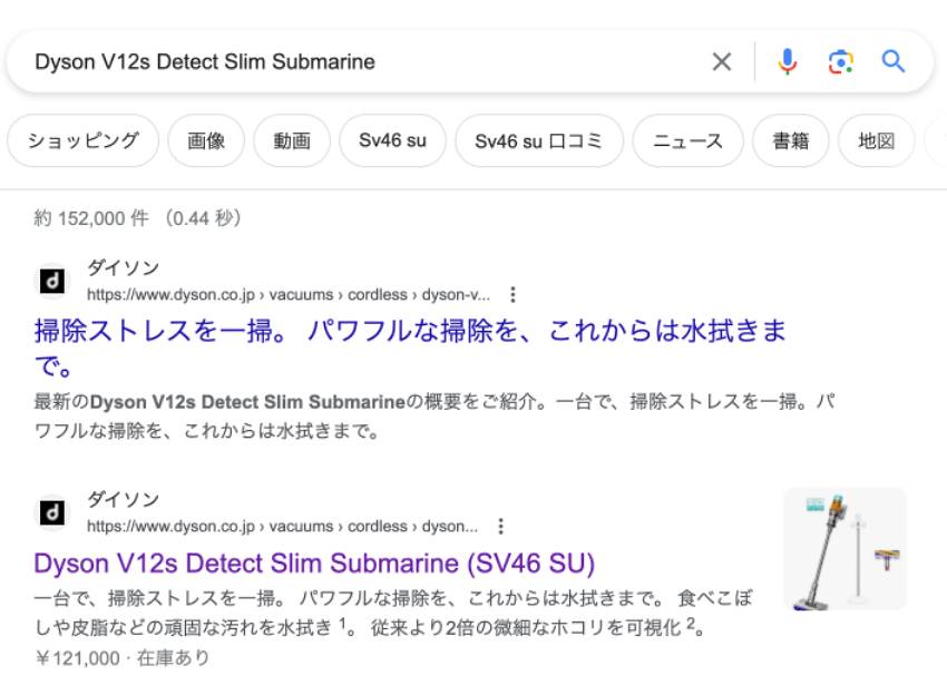 Dyson社の商品名で検索した結果、1位と2位にDyson社のサイトが表示される。商品についての情報を知りたいニーズと、商品を購入したいニーズによってページが分れており、両者ともに存在している。