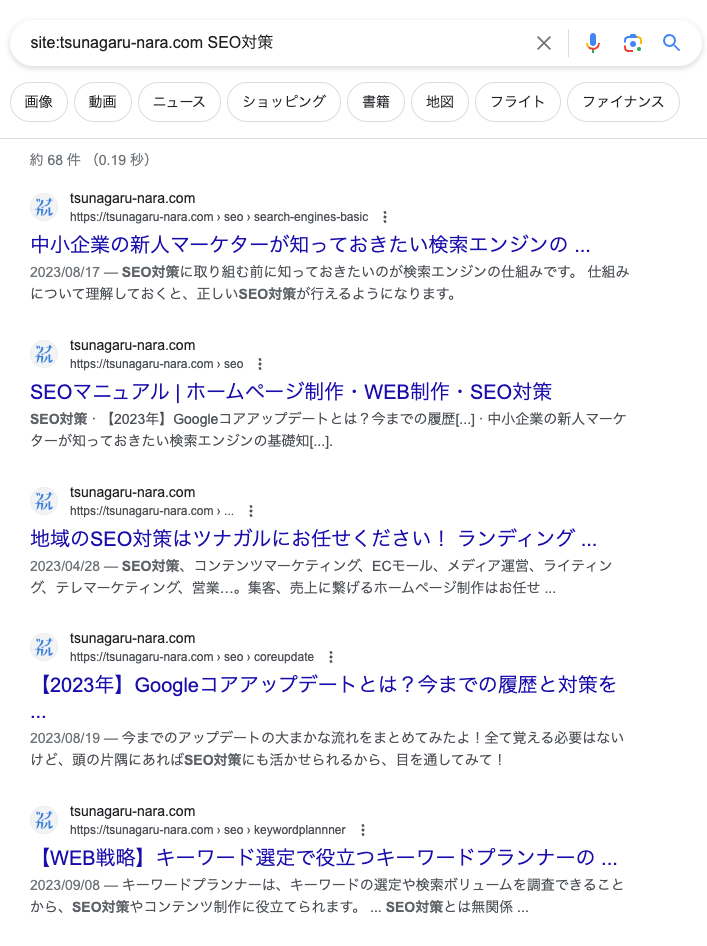 Google の検索窓で site:ドメイン キーワードで検索する。キーワードは、カニバリゼーションが疑われるページに使われているキーワードです。