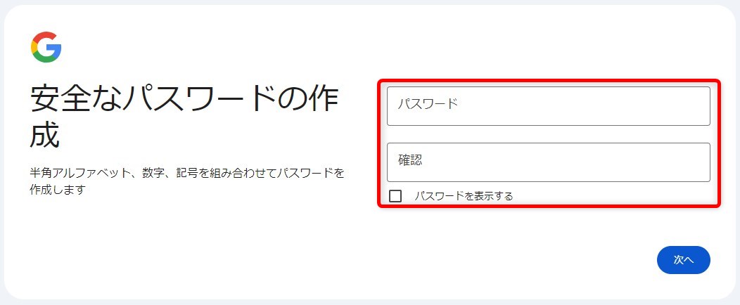 希望する「パスワード」を入力し「次へ」をクリック。
