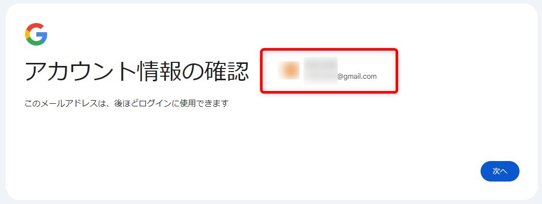 希望する「Gmailアドレス」を入力し「次へ」をクリックします。
