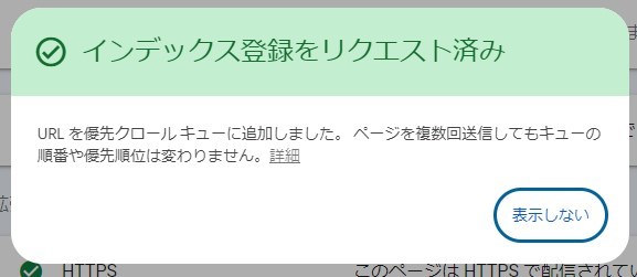 インデックス登録のリクエストは、あくまでGoogleに対して「見に来てね」とお願いする機能であり、必ずしもすぐに登録されるわけではありません。