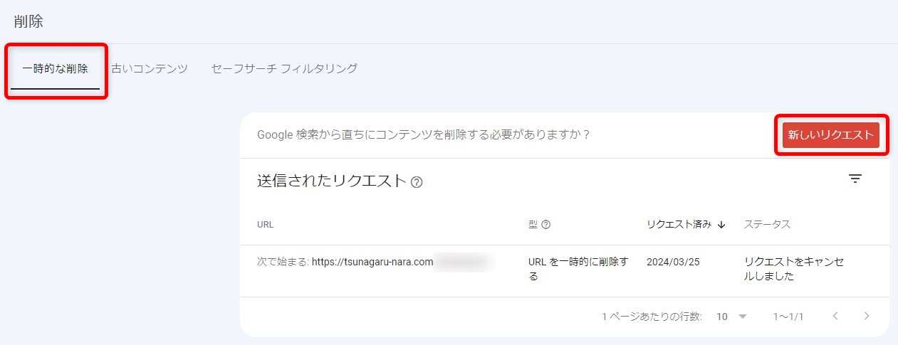 「一時的な削除」→「新しいリクエスト」をクリックします。