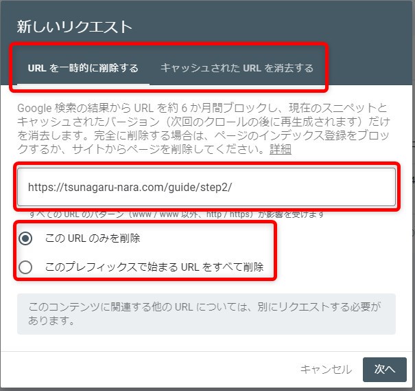 削除方法を選択のうえ、URLを入力し「次へ」をクリックします。