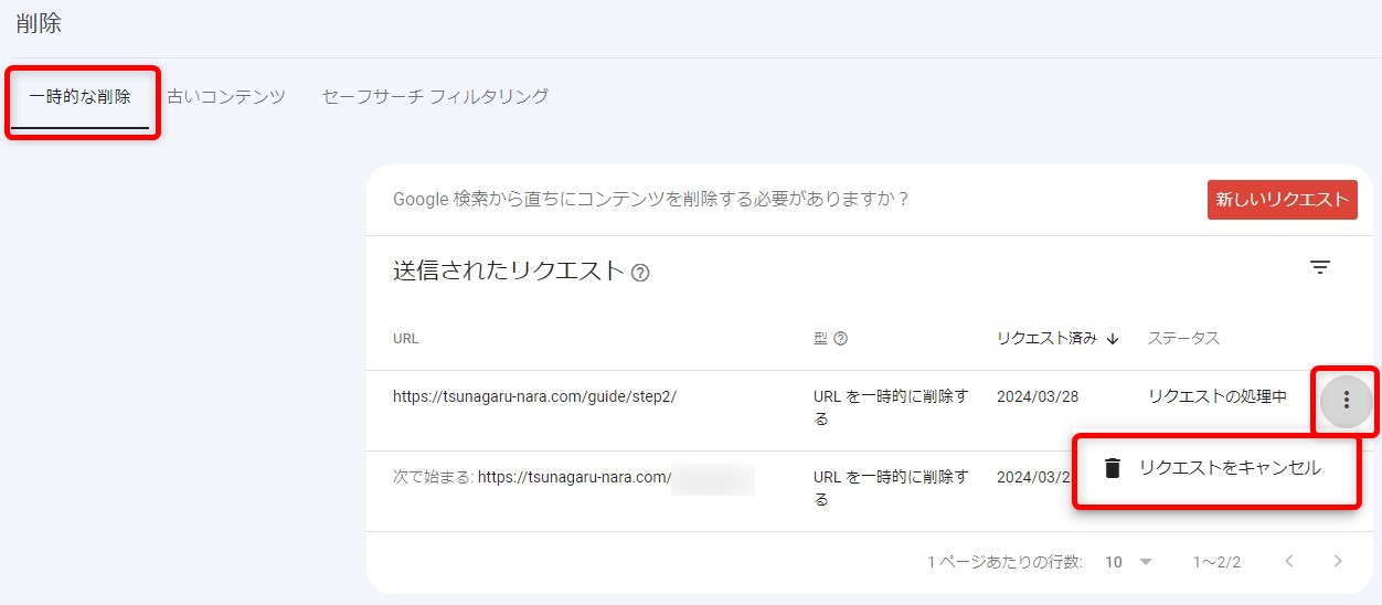 もし、削除の依頼を取り消したい場合、「一時的な削除」から、対象URLの「︙」マークをクリックし、「リクエストをキャンセル」を選択します。
