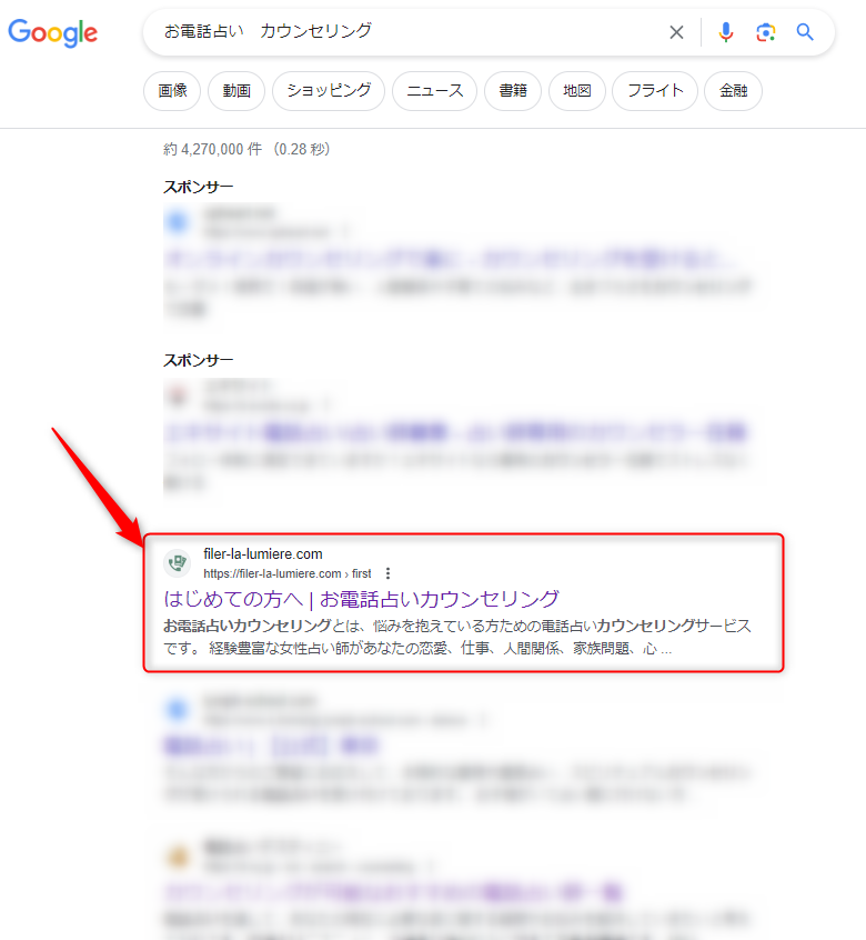 そのため、「お電話占い+カウンセリング」という複合キーワードでSEO対策を行いましょう、とご提案させていただいたところ、2023年6月9日に公開し、わずか17日目にしてキーワードで1位表示を獲得。