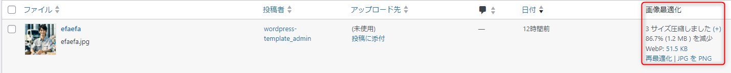 ③「画像最適化」の欄にて、圧縮率や、WebPのファイルサイズが確認できます。