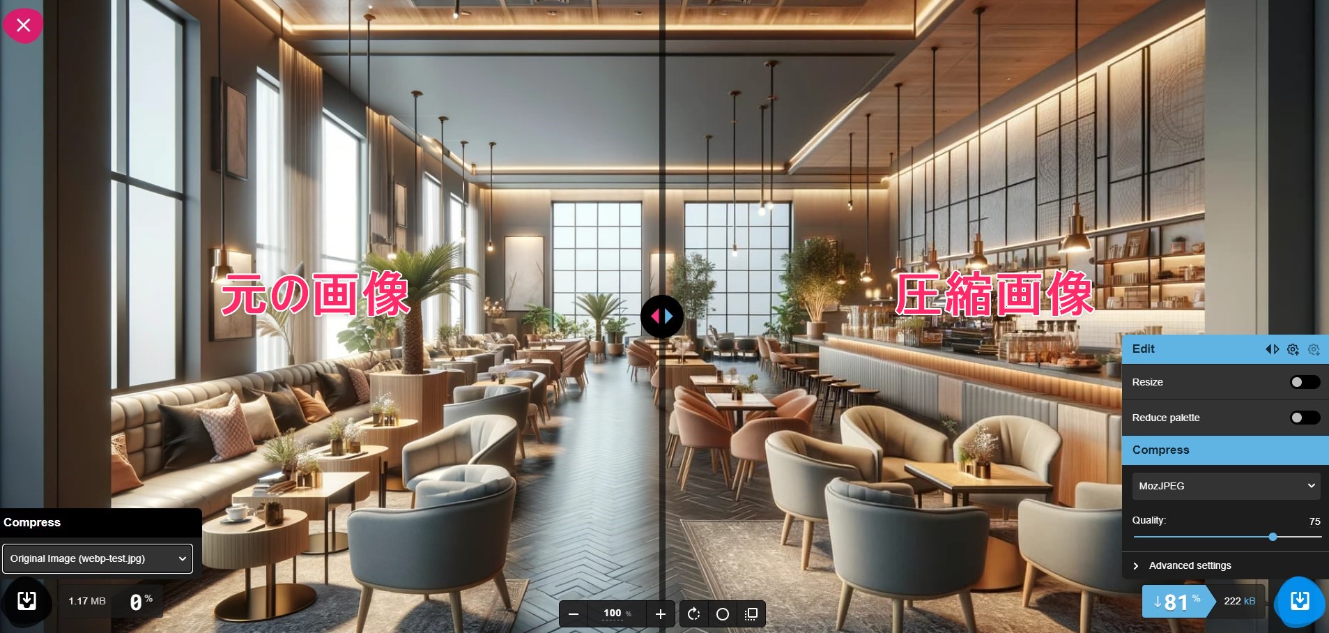 ■左が元の画像、右が圧縮した画像です。真ん中のタブで変化を確認できます。