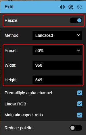 ■以下の要素を調整することで、リサイズ・ファイル形式・圧縮率の設定ができます。