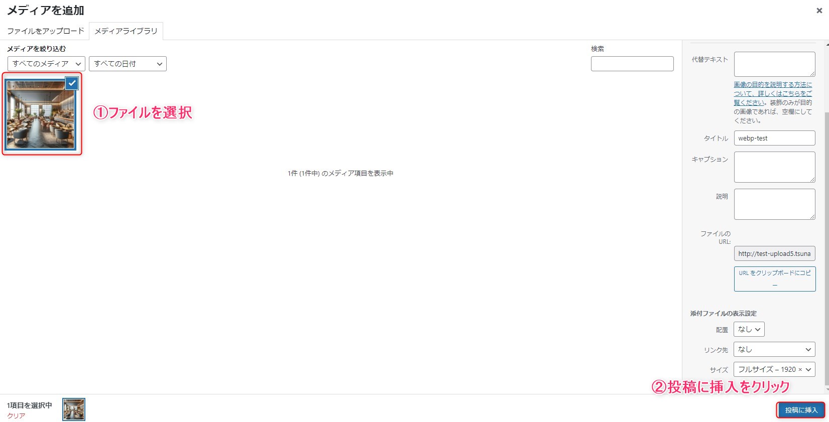 ④「ファイルを選択」し「投稿に挿入」をクリックします。