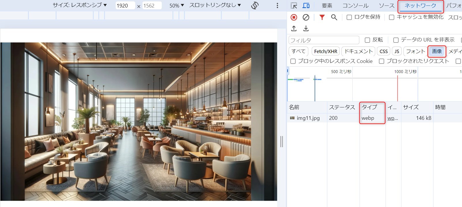 ②「ネットワーク」>「画像」とクリックし、タイプ欄が「webp」と表記されていれば、WebP形式の画像が適応されています。